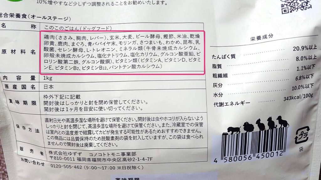 「このこのごはん」パッケージ裏面の原材料名欄。鶏肉(ささみ、胸肉、レバー)から始まり、鹿肉、まぐろ、青パパイヤ末、モリンガなどが記載されている