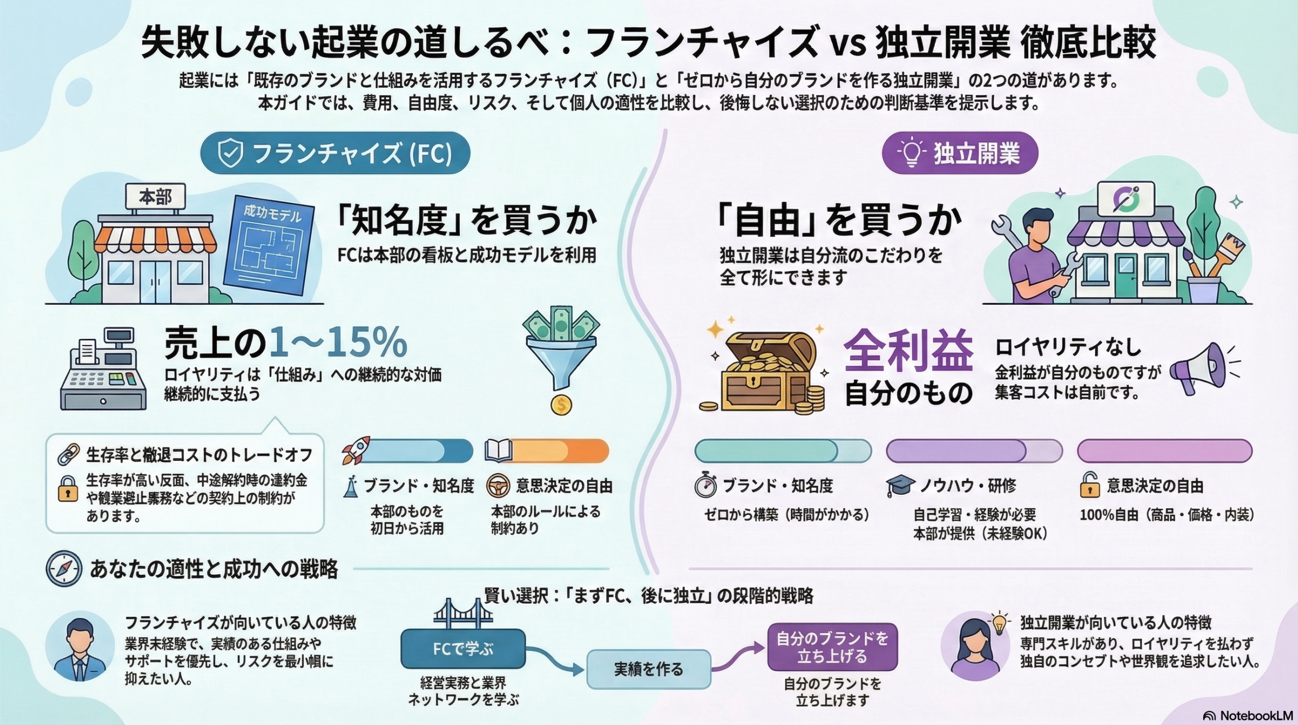 フランチャイズと独立開業、それぞれの特性をまとめます。