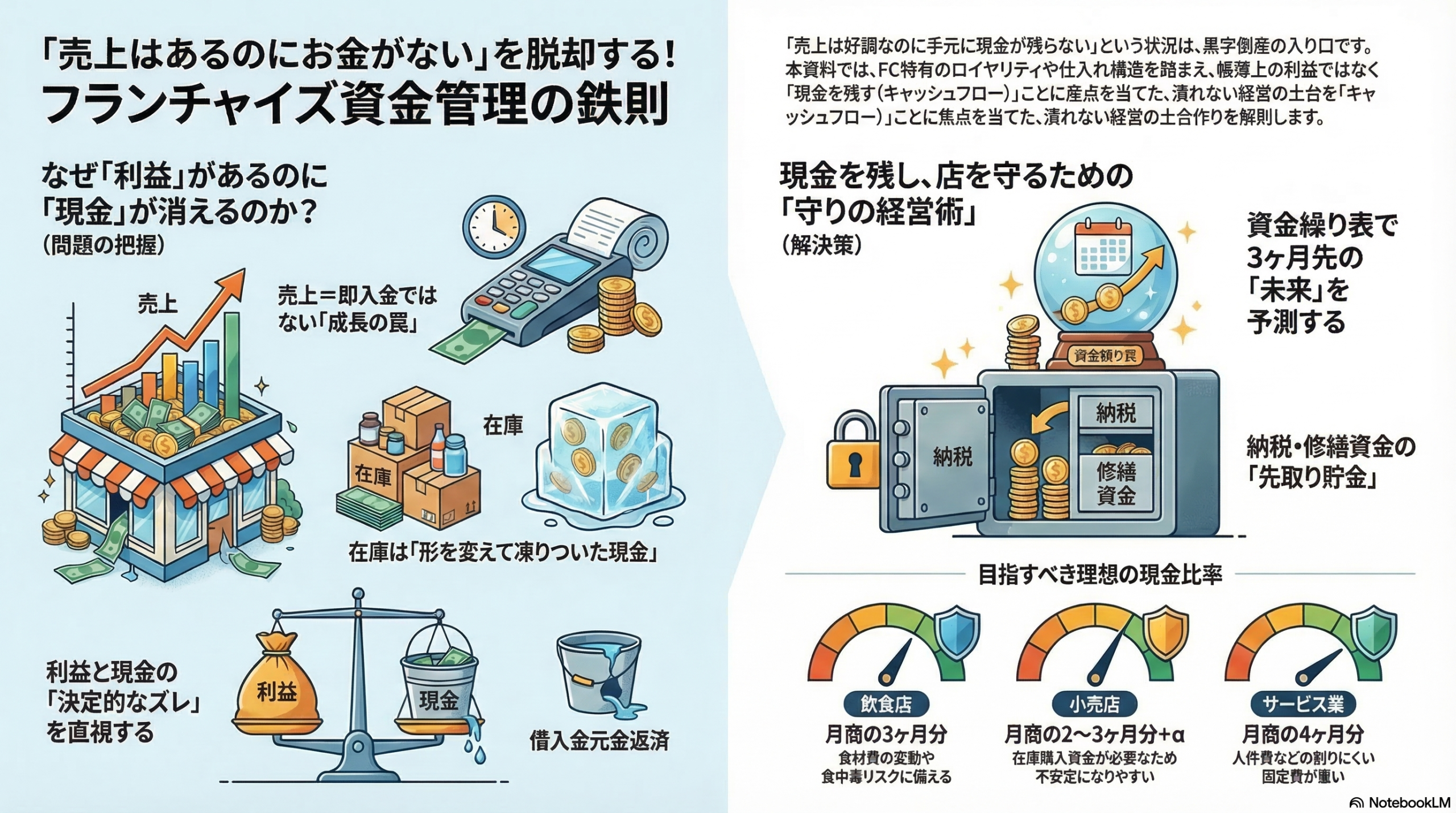 「今月も売上は目標を達成した。客足も絶えない。それなのに、なぜか手元に現金が残っていない……」。 フランチャイズ運営を始めて数ヶ月、あるいは数年。そんな得体の知れない不安に、夜も眠れない日々を過ごしていませんか?売上という「華やかな数字」の裏側で、目に見えない浸食のようにあなたの手元から現金(キャッシュ)が消えていく。これは、多くの新米オーナーが直面し、そして音を立てて崩れ去っていく「黒字倒産」への入り口です。