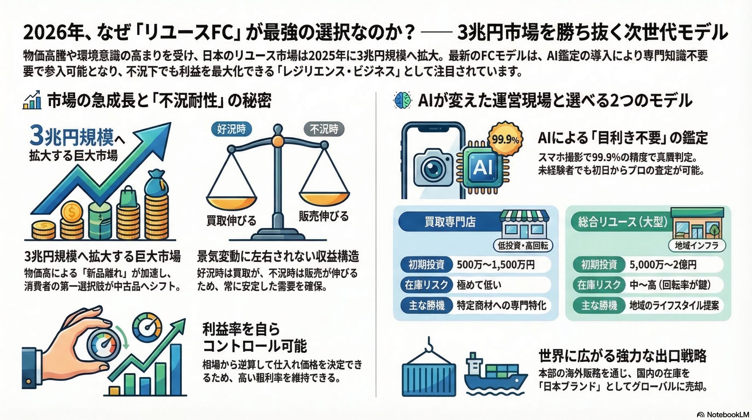いま、フランチャイズ市場で最も熱い視線を浴びているのが「リユースFC」です。 2025年の統計データによれば、中古市場は3兆円規模へと拡大し、その成長曲線は右肩上がりを続けています。本記事では、なぜ今リユースFCが「負けない選択」と言われるのか、その裏側にある圧倒的な収益構造と、2026年以降の勝ち筋を徹底解剖します。